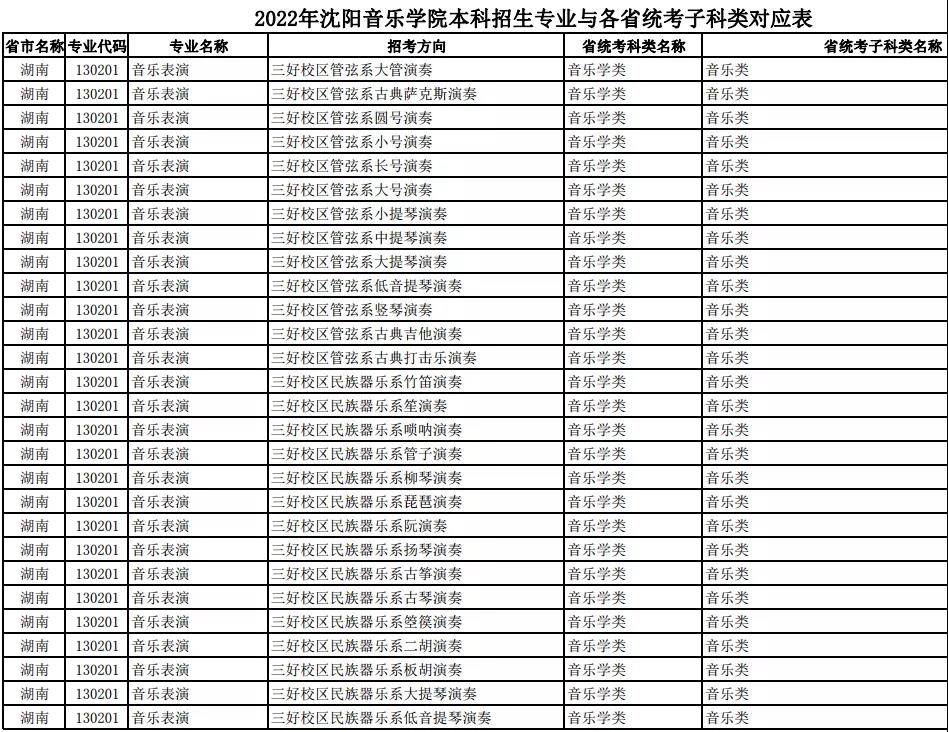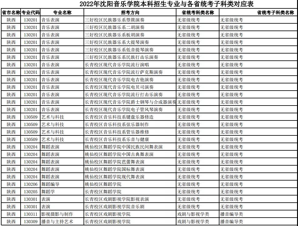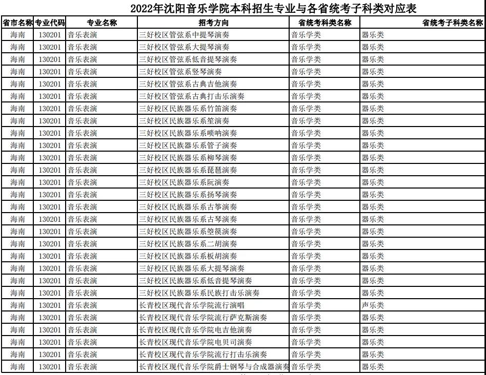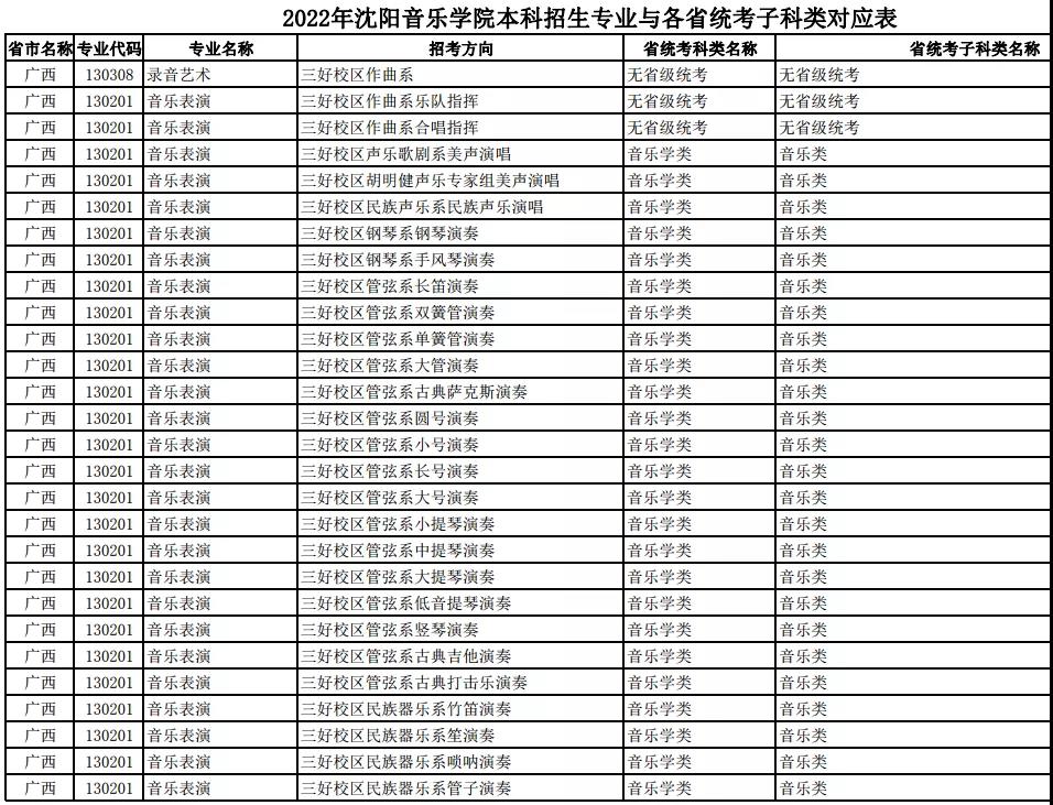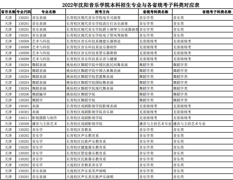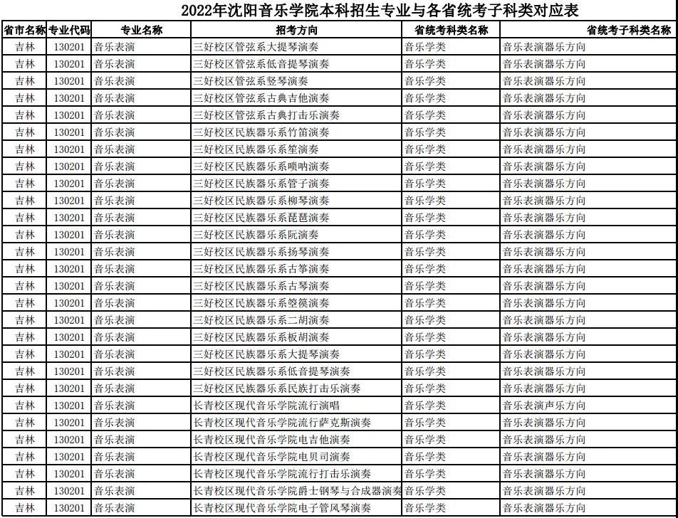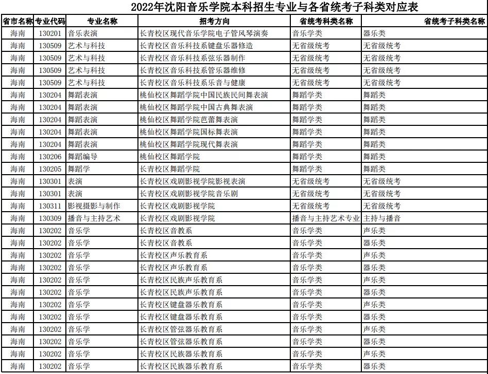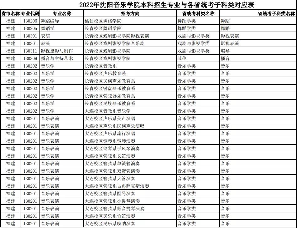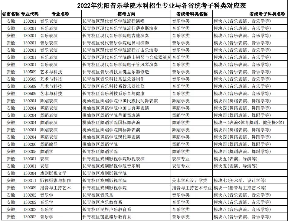 校考 | 沈阳音乐学院2022年本科专业与各省统考子科类对应表