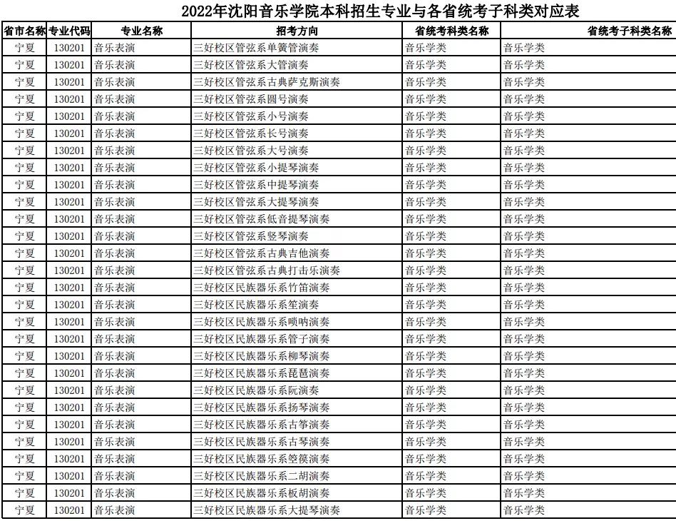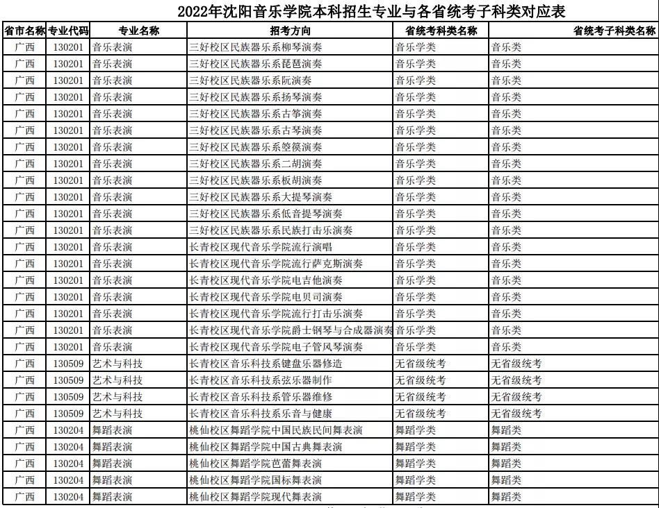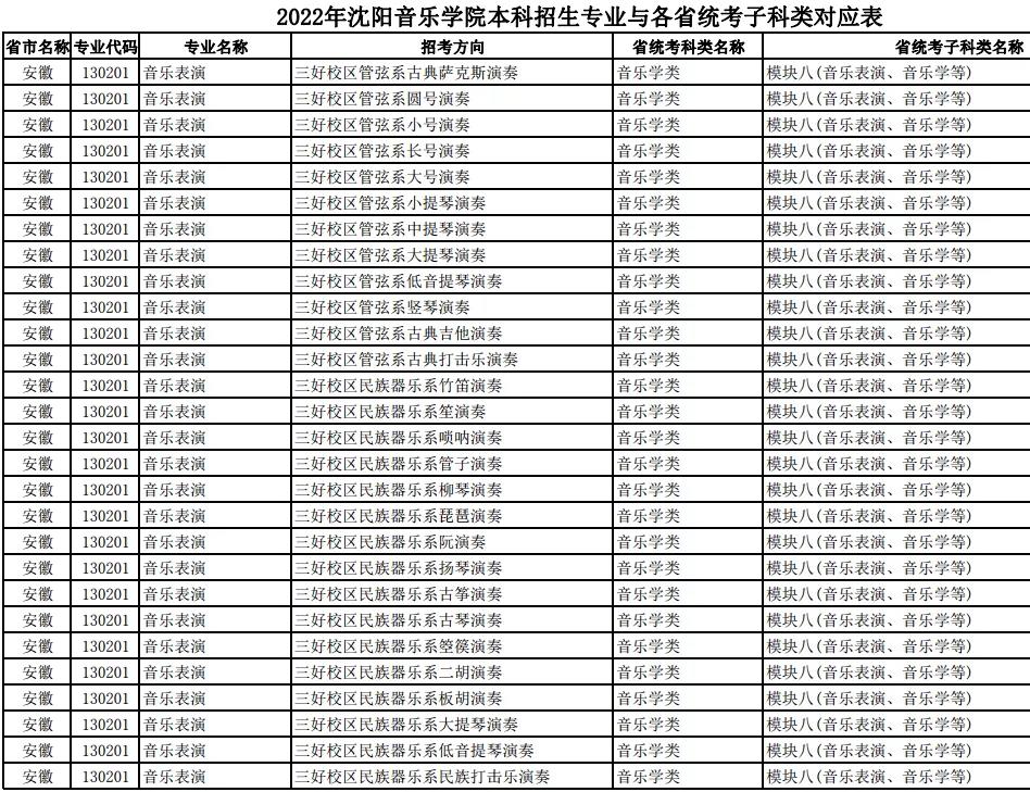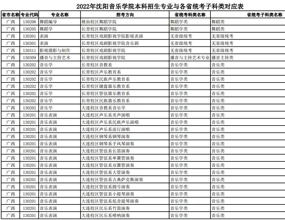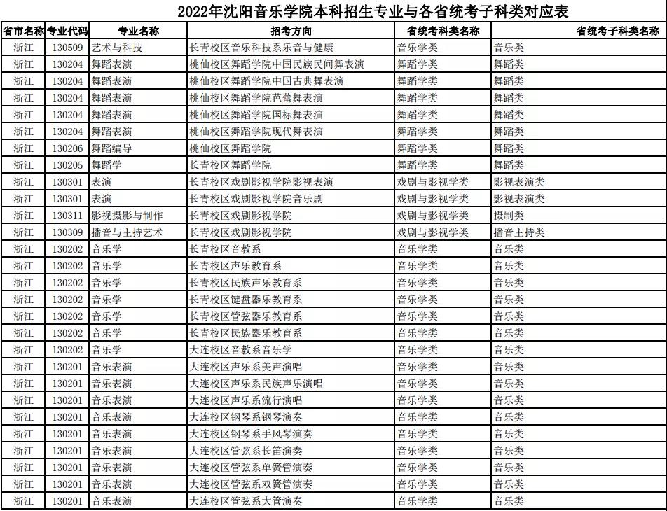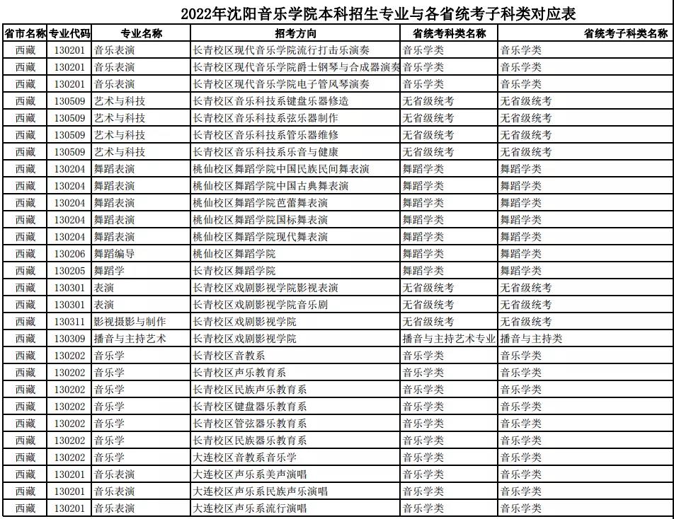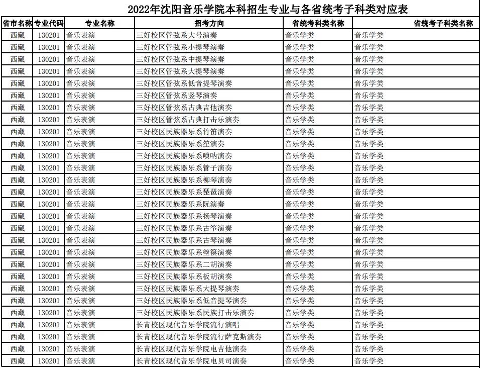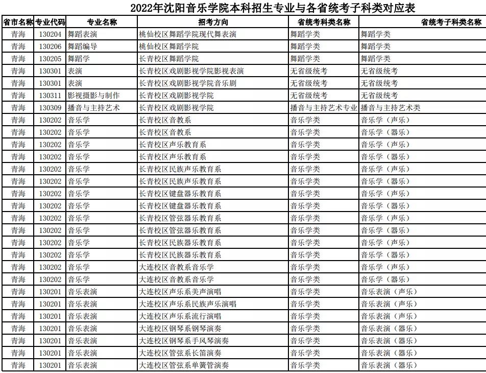 校考 | 沈阳音乐学院2022年本科专业与各省统考子科类对应表
