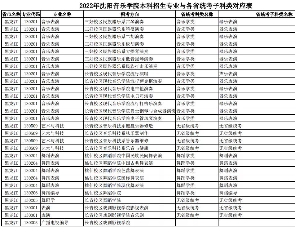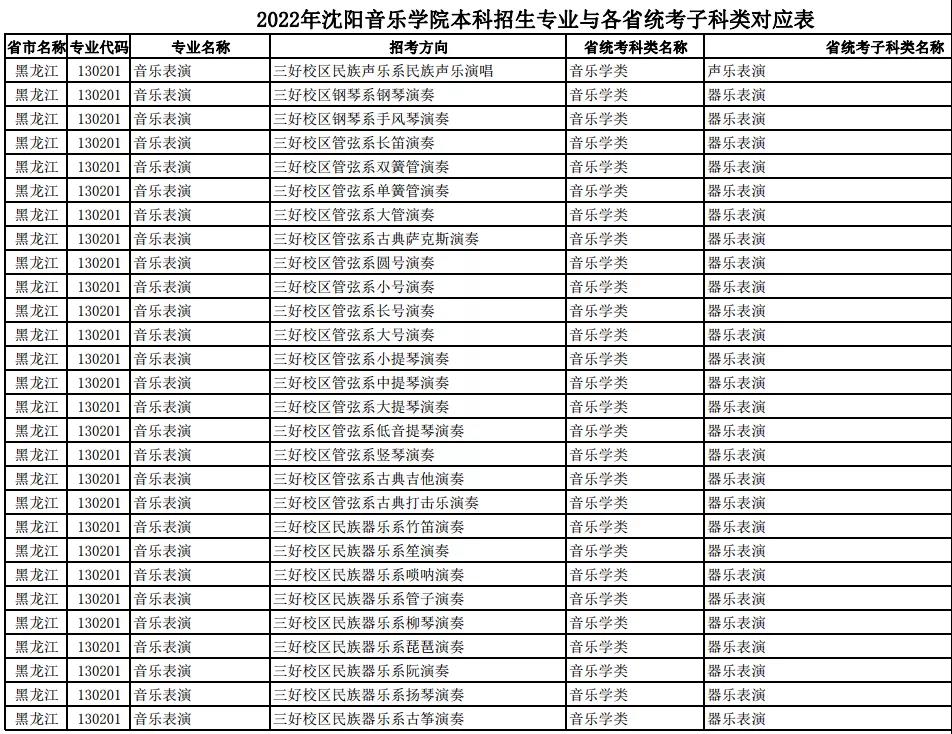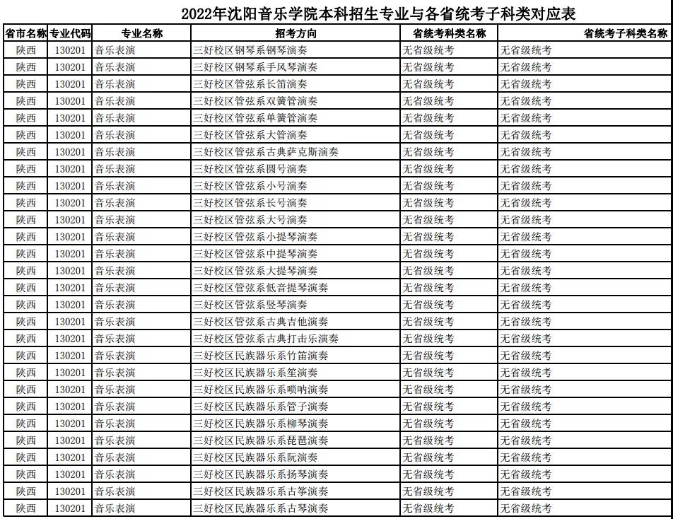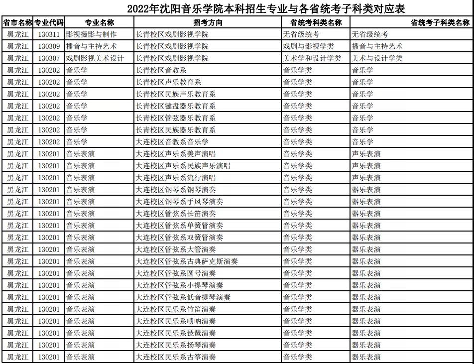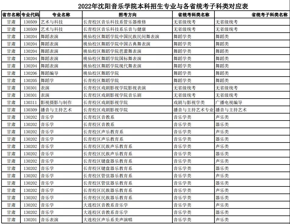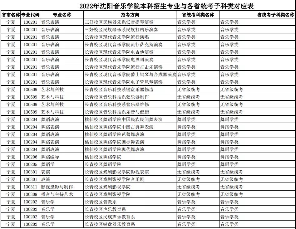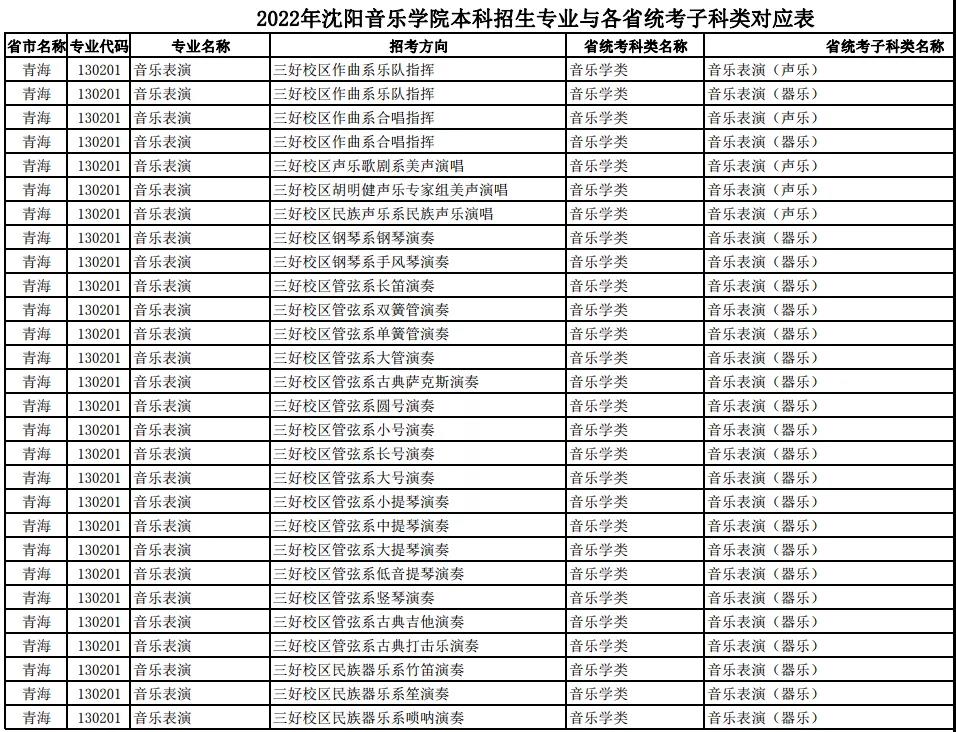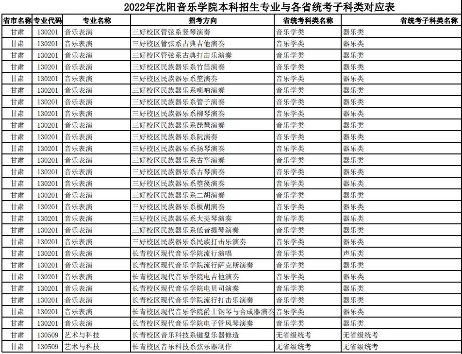 校考 | 沈阳音乐学院2022年本科专业与各省统考子科类对应表