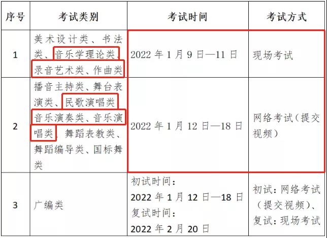 美术设计类、书法类、音乐学理论类、录音艺术类、作曲类:2022年1月6日-8日;