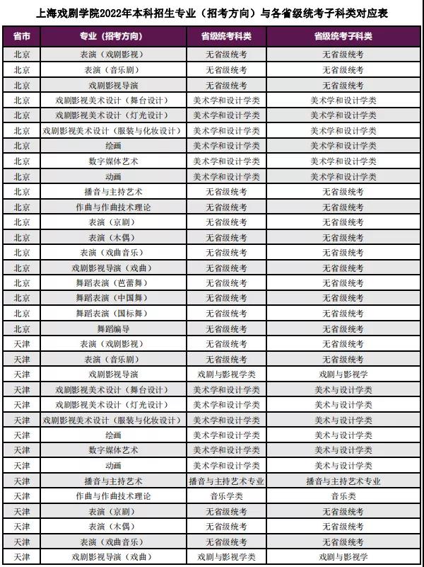 2. 根据教育部有关文件精神,我校艺术类校考专业在省级统考合格考生范围内组织校考,考生所报专业(招考方向)属于省级统考涵盖范围内的,考生须达到相应省级统考科类本科合格标准,省级统考未涉及或不要求的专业,考生可直接参加校考。拟招生专业(招考方向)与各省级统考对应关系请查看附件1《上海戏剧学院2022年本科招生专业(招考方向)与各省级统考子科类对应表》,若一个招生专业(招考方向)对应多个省级统考科类,则任选其中一个统考科类参加考试并须达到该科类统考本科合格标准。