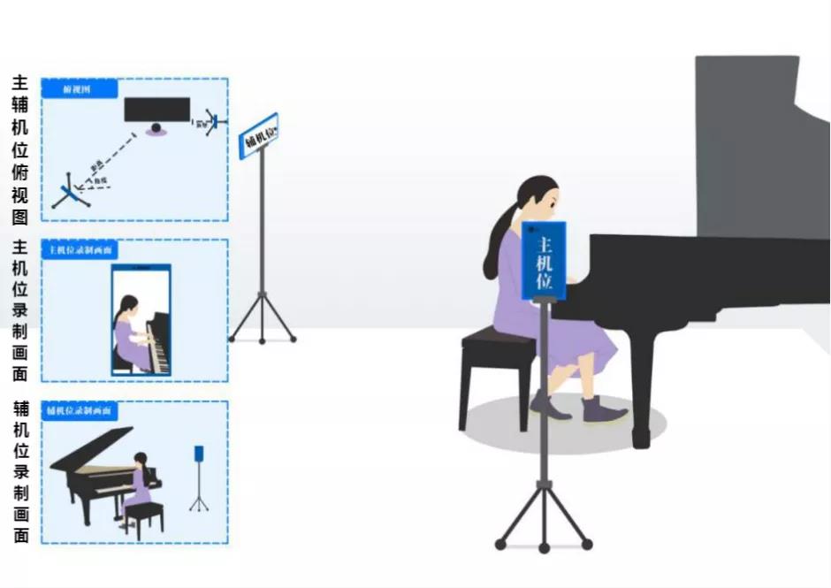 【主机位竖屏或者横屏拍摄(拍摄范围含:考生侧脸、手部及钢琴琴键),辅机位横屏拍摄(考试全场监控,拍摄范围含:考生及周边),考生全程不能离开视频拍摄范围】