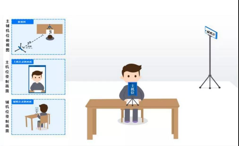 【主机位竖屏拍摄(拍摄范围含:考生正面半身、手部、答卷及桌面),辅机位横屏拍摄(考试全场监控,拍摄范围含:考生、答卷、桌面及地面),考生与答卷全程不能离开视频拍摄范围】