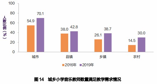 报告中对比了2016年和2019年农城市、乡镇、农村小学艺术教师的教学需求,均有较大提高。农村小学艺术教师配备虽有较大改善,但仍存在不能满足现实教学需求的情况。