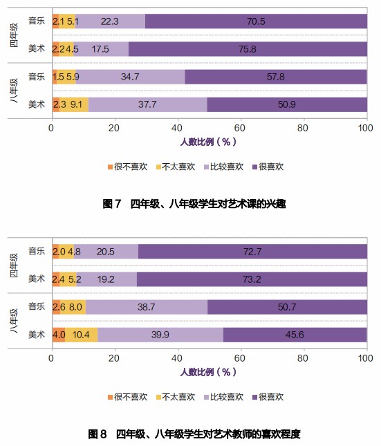本次监测通过问卷调查了学生对艺术课的兴趣和对艺术教师的喜欢程度。以四年级和八年级为样本,喜欢音乐课、美术课的比例分别为 92.8、93.3。大部分中学生还是喜欢音乐、美术,对艺术有学习的兴趣。
