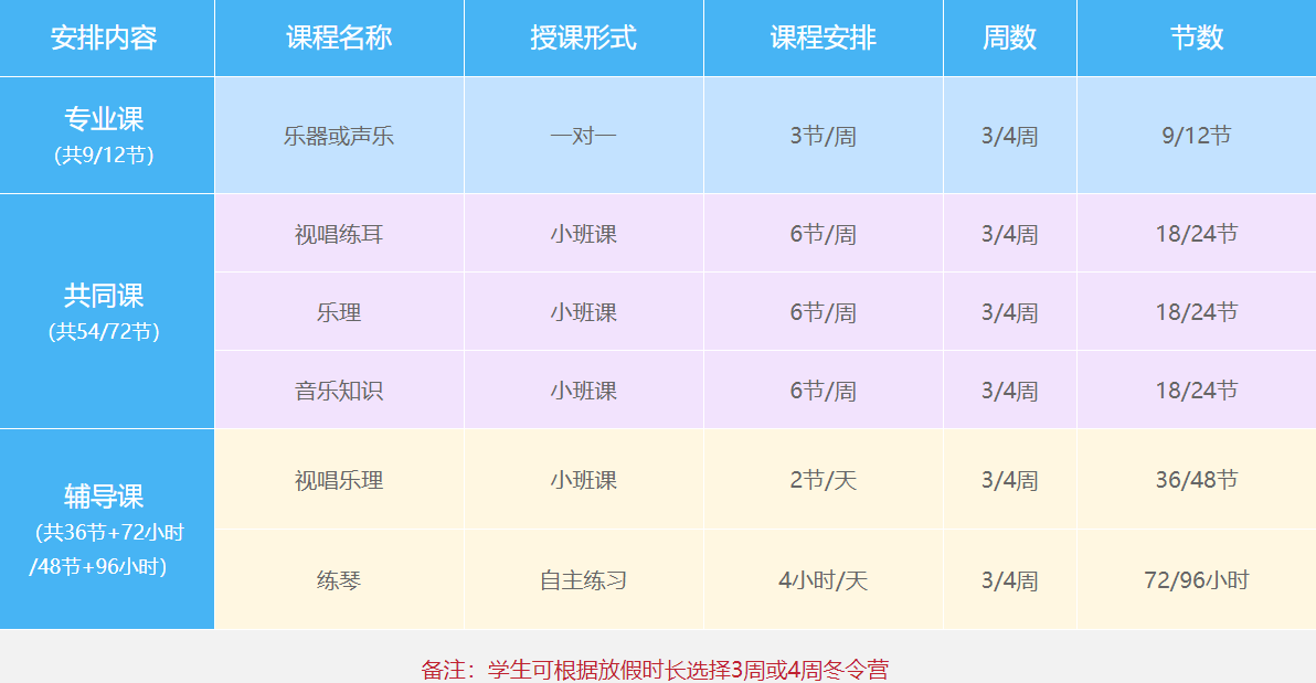 不仅有冬令营、夏令营,还有附中考学、本科考学、音乐考研、班等各阶段课程。 提供全科类、全年龄、全方位、全系统的音乐教学,专业度及行业内无人能及,深入了解各大院校不为人知的考学内幕。