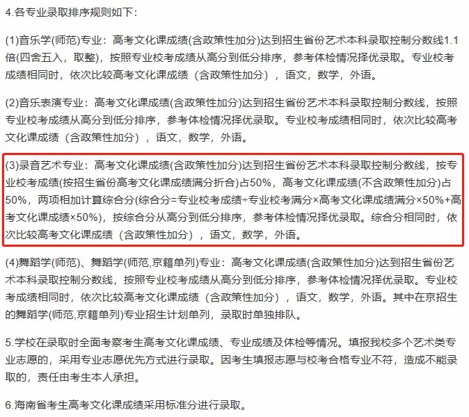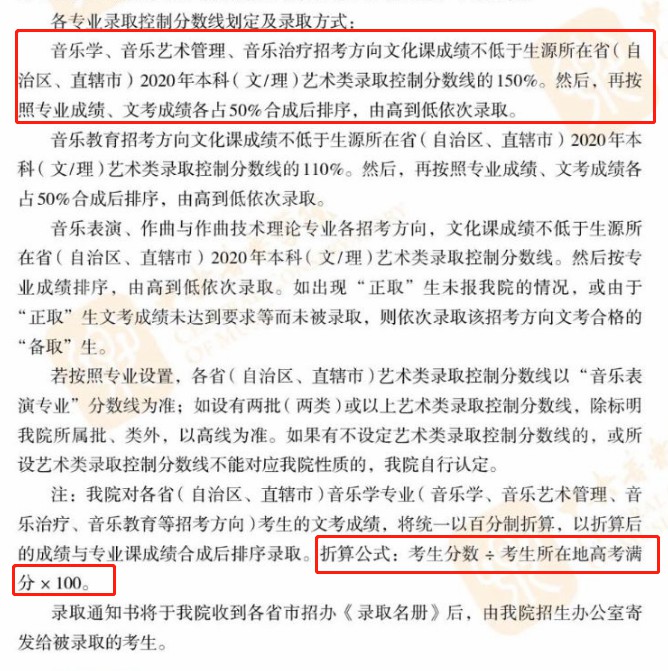 文化课过线,文化课一定比例+专业课一定比例相加或折合计算综合分录取,你可就要好好算一算综合分了。比如:2020年中央音乐学院音乐学专业、音乐教育专业,文化与专业各占50合成成绩排序,上海音乐学院录音艺术专业是按专业占90与文化占10折算总分,星海音乐学院作曲与作曲技术理论专业是按专业占70+文化占30折算总分,较后算综合分录取。
