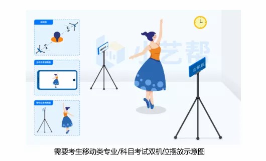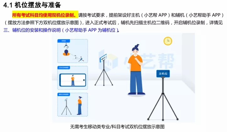 (9)在正式考试前请务必进行,熟悉小艺帮 APP、小艺帮助手 APP 的操作流程和考试流程,以免影响正式考试。时,按照机位摆放图例要求,多次测试正式考试时双机位摆设位置,确定拍摄点及拍摄角度,高效利用考试时间。(因考前练习及数据占用手机内存空间,注意在正式考试开始之前清理数据)
