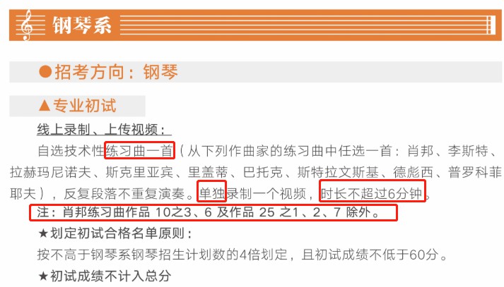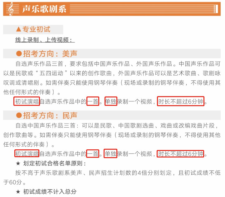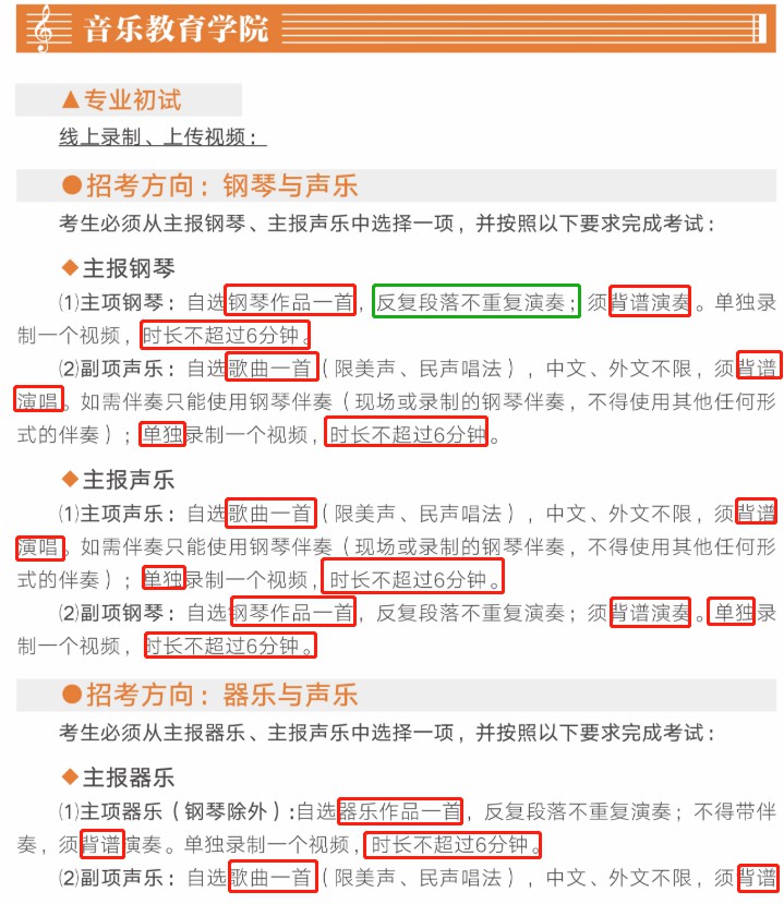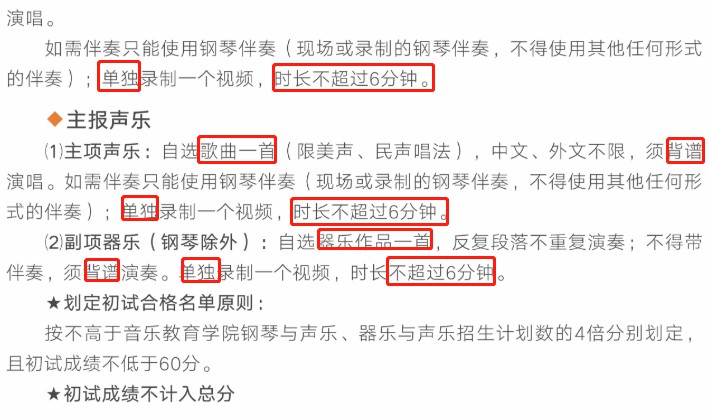 6、视频录制一镜到底,不间断录制,“主机位”画面中仅允许出现考生本人,不得出现钢琴伴奏等任何其他人员,不得做任何打招呼和有暗示性的言语行为,不得出现任何可能影响评判公正的信息或标识(如含考生信息的提示性文字、图案、声音、背景、着装等),更不得出现考生姓名、生源地、考生号、证件号、就读学校、培训机构等相关信息,否则将被视为违规,并取消考试资格。不得对考试内容进行截图、翻录、传播及任何形式的公开。