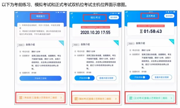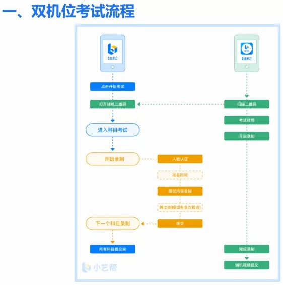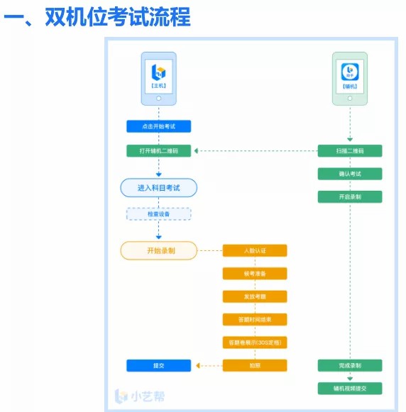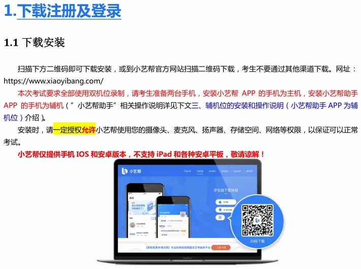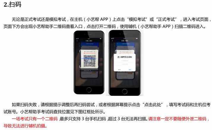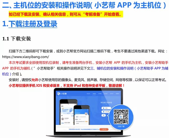 1、采用双机位考试模式,仅可使用两台手机完成考试。为了顺利安装小艺帮 APP 及小艺帮助手 APP,建议考生使用安装有系统为 android 7.0 或 ios 10.0 以上的近两年主流品牌机(例如华为、小米、oppo、vivo、iPhone等),如果考生因上传原因造成我校无法下载或样式错乱,责任由考生自行承担。