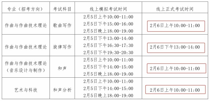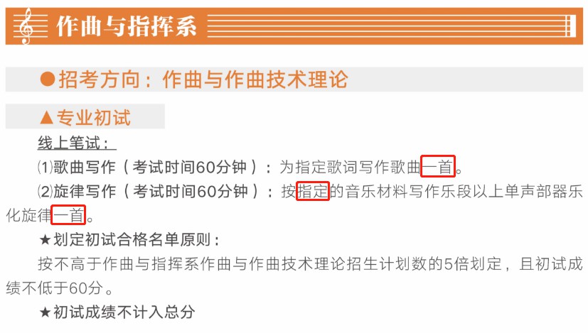 笔试类考试科目范围:作曲与作曲技术理论专业的初试歌曲写作、旋律写作考试科目;作曲与作曲技术理论(音乐设计与制作)专业的初试和声考试科目;艺术与科技专业的初试和声分析考试科目。