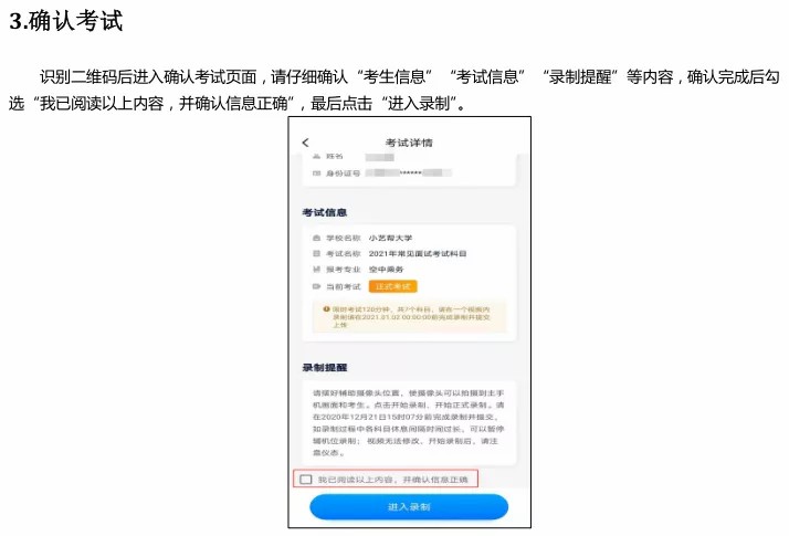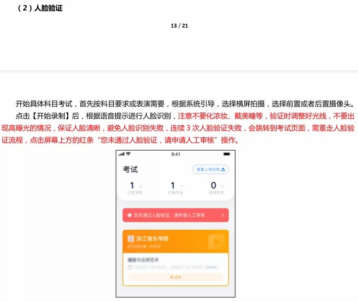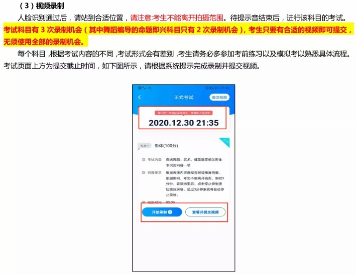 5、只能使用手机通过指定 APP 录制并上传视频。录制时,不支持变焦、暂停、编辑等功能;只允许使用手机内置的摄像头和麦克风;录制时考生要将全身录入,必须连续不间断拍摄,期间不得转切画面,视频画面要求保持稳定、声像清晰,声音、图像同步录制,不得采用任何音视频编辑手段美化处理声音、画面;考试过程中禁止考生私自进行录像和录屏、录音等,严禁将相关信息泄露或公布。