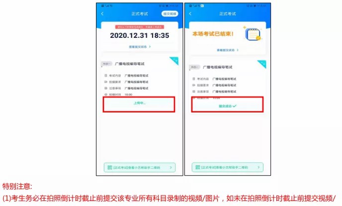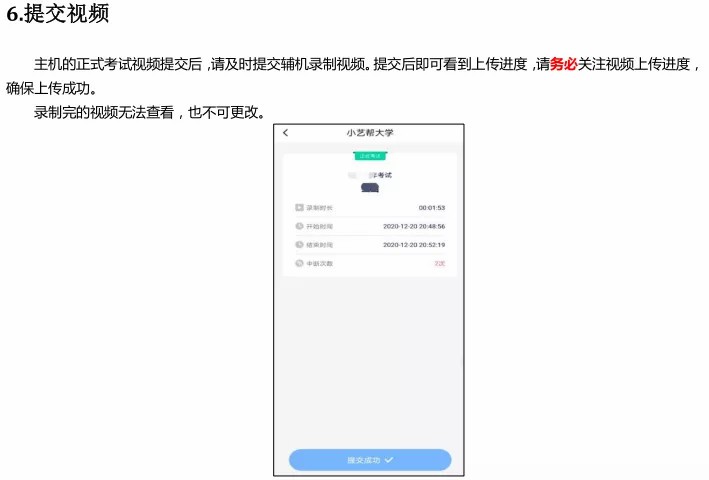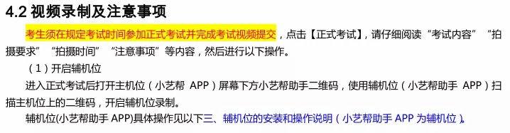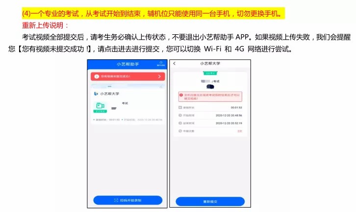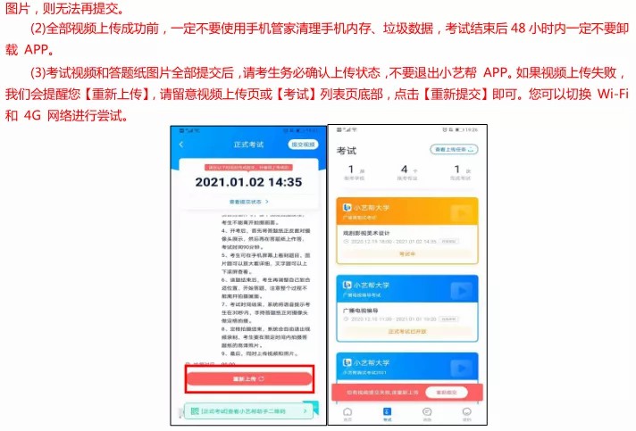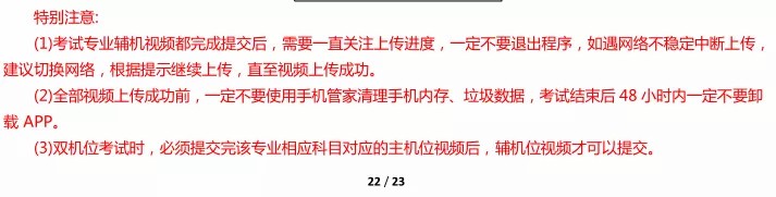(2)全部视频上传成功前,一定不要清理手机内存、垃圾数据等,考试结束后 48 小时内一定不要卸载小艺帮APP 及小艺帮助手 APP。考试结束提交视频时请务必使用原考试手机操作,不要更换手机。