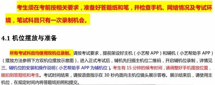 (1)采用双机位考试模式,仅可使用两台手机完成考试。为了顺利安装小艺帮 APP 及小艺帮助手 APP,建议考生使用安装有系统为 android 7.0 或 ios 10.0 以上的近两年主流品牌机(例如华为、小米、oppo、vivo、iPhone等),如果考生因上传原因造成我校无法下载或样式错乱,责任由考生自行承担。