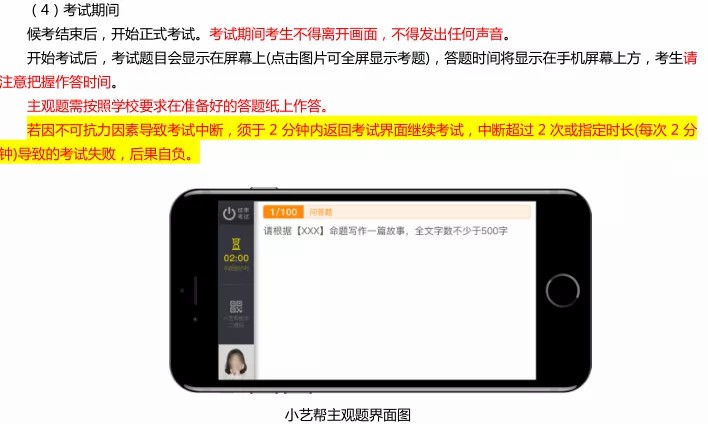 3、正式考试时,如出现主机退出小艺帮 APP、接通来电、点击进入其他应用程序等中断小艺帮 APP 运行的操作,均会导致考试终止。