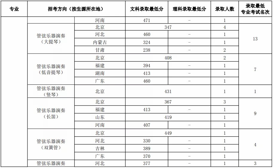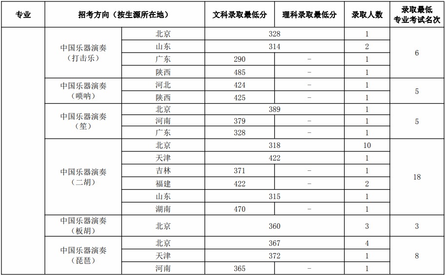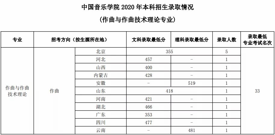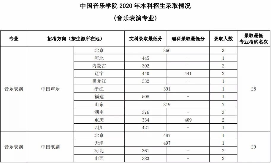 中国音乐学院2020年本科招生录取情况(音乐学、作曲与作曲技术理论、音乐表演)