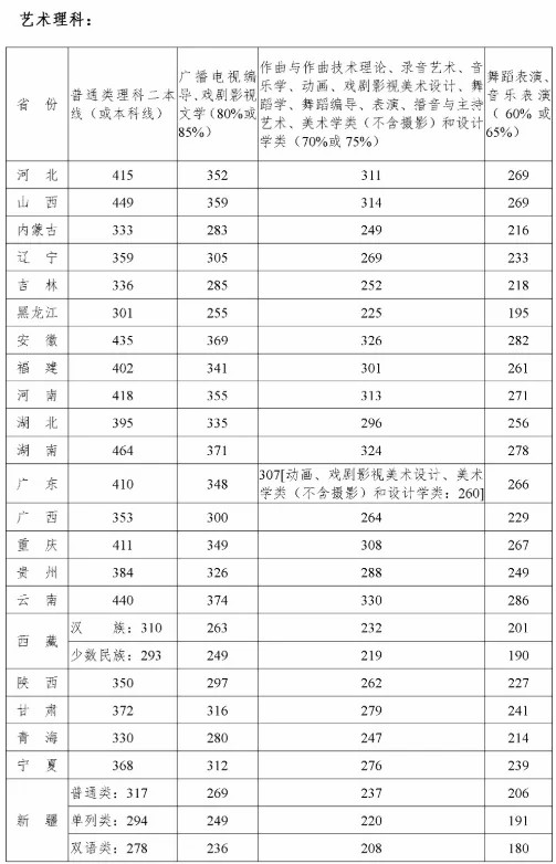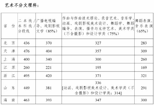 一、陕西省:音乐学、音乐表演、作曲与作曲技术理论、录音艺术、舞蹈编导、舞蹈学、舞蹈表演、艺术与科技专业高考文化课录取控制分数线艺术类文科为304分,艺术类理科为263分。