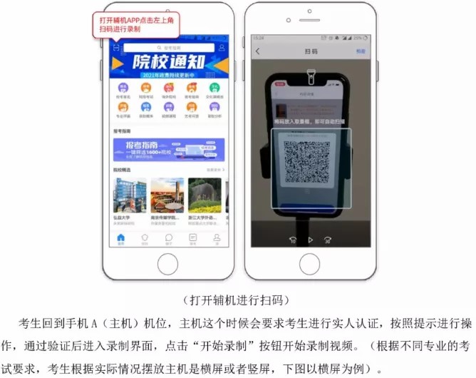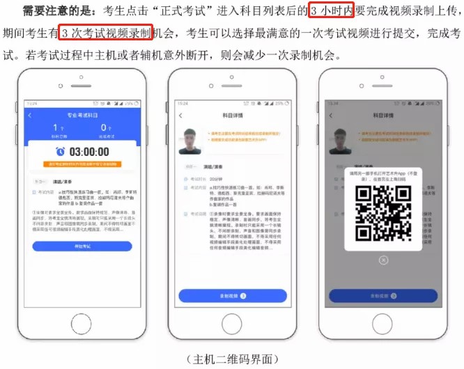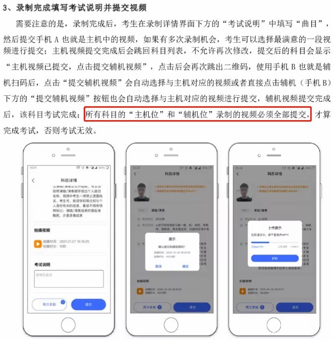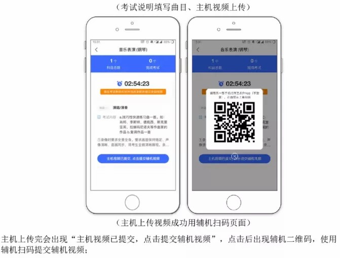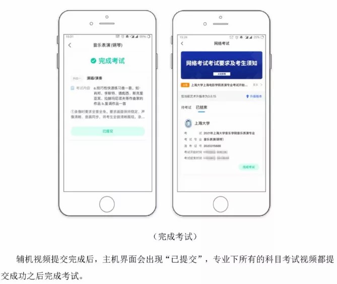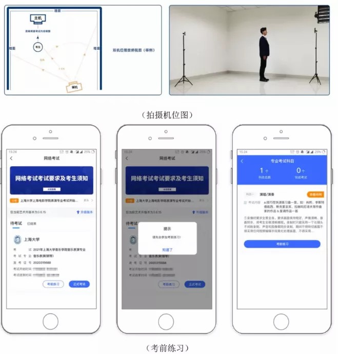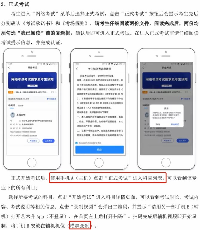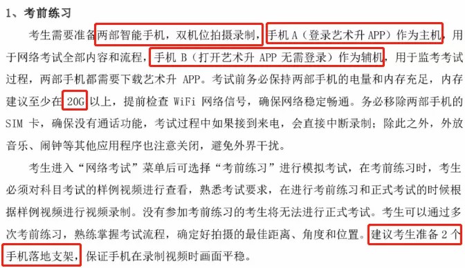 2.考生需要准备两部智能手机,双机位拍摄录制,手机A(登录艺术升APP)作为主机,用于网络考试全部内容和流程,手机B(打开艺术升APP无需登录)作为辅机,用于监考考试过程,两部手机都需要下载艺术升APP。(具体机位摆放要求详见《上海大学音乐学院2021年音乐表演专业(初试)线上考试操作流程》)。考试前务必保持两部手机的电量和内存充足,内存建议至少在20G以上,提前检查WiFi网络信号,网络稳定畅通。务必移除两部手机的SIM卡,没有通话功能,考试过程中如果接到来电,会直接中断录制;除此之外,外放音乐、闹钟等其他应用程序也注意关闭,避免外界干扰。考试结束后,“主机位”和“辅机位”录制的视频必须全部提交,否则考试无效。