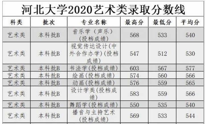 河北大学2020艺术类录取分数线(河北省)