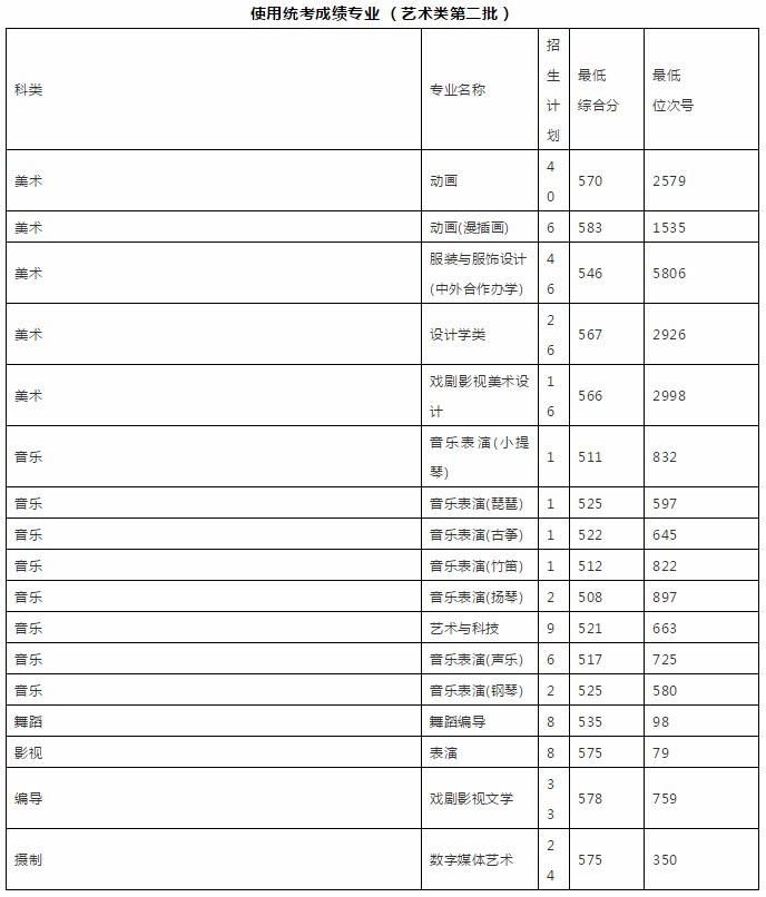 根据及国家民委相关文件规定,结合我校艺术类招生章程及各专业(方向)计划招生数,校招生工作领导小组对校考合格名单中一志愿报考我校且高考投档成绩不低于生源所在地省级招办划定的艺术类相应批次文化录取分数线的考生,按照校考专业成绩从高到低排队,划定了各专业(方向)分数线。详情如下:
