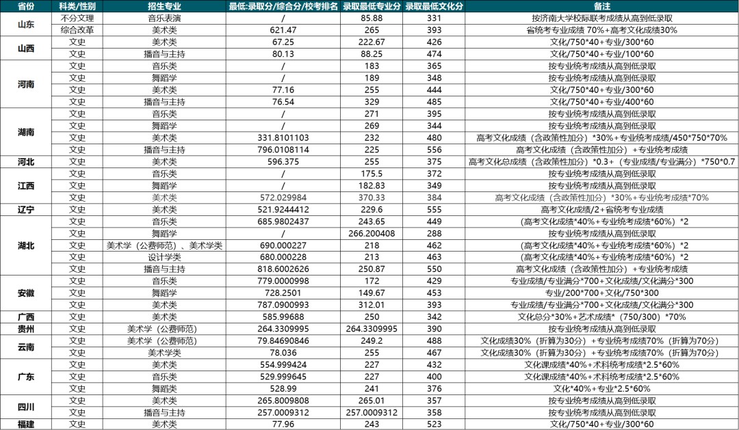注:1.如某专业录取末位有校考专业成绩相同的情况,先按少数民族优先、再按高考文化成绩与所在省本科一批线比值高者优先的原则进行录取。2.遵照今年招生文件的较新规定,所有高考加分项目及分值不适用于不做分省计划的招生专业。