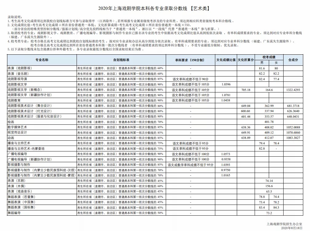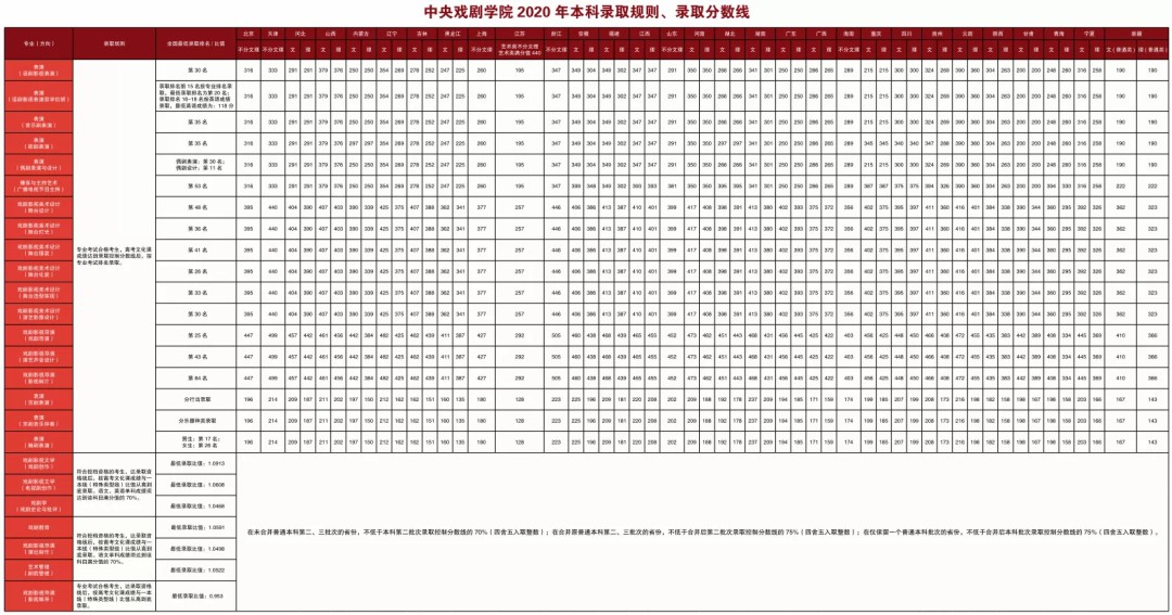 2. 戏剧影视文学专业(剧作)报考考生须符合所在省普通高等学校2020年度招生工作规定中艺术类专业报考要求,符合所在省对应我校艺术类本科录取批次的志愿填报以及投档录取要求,对于所在省艺术类省级统考涵盖的专业须省级统考成绩合格,文化考试成绩与考生所在省本科一批录取较低控制分数线(文、理)的比值达到95后,按照比值排序择优录取。较终比值为:108.59。