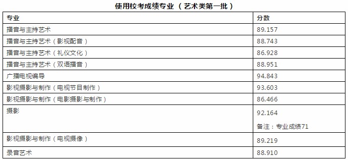 6. 录音艺术专业(电影录音) 专业考试合格的考生,文化考试成绩达到所在省本科一批录取较低控制分数线(文、理)的90后,按参加普通高等学校招生考试中的文化考试成绩与所在省本科一批录取较低控制分数线(文、理)的分数比值从高到低排序,择优录取。较终比值为:99.40。