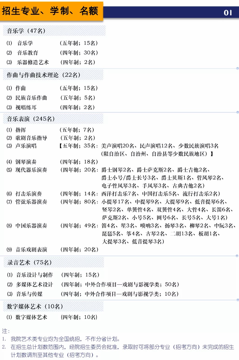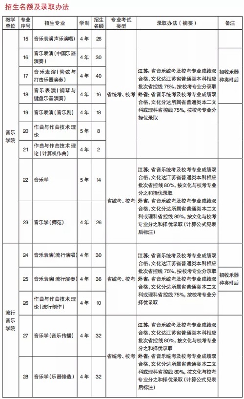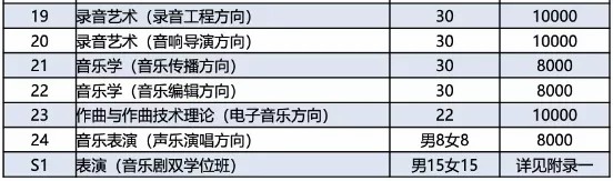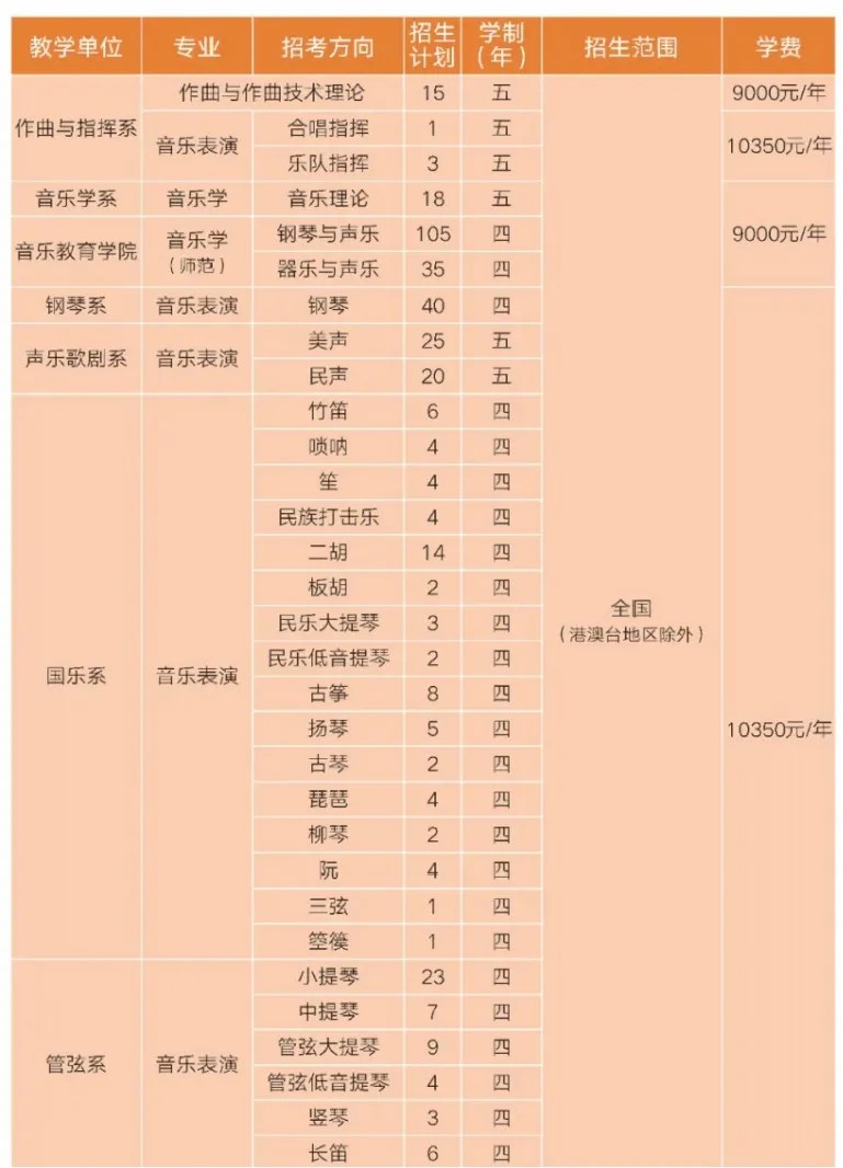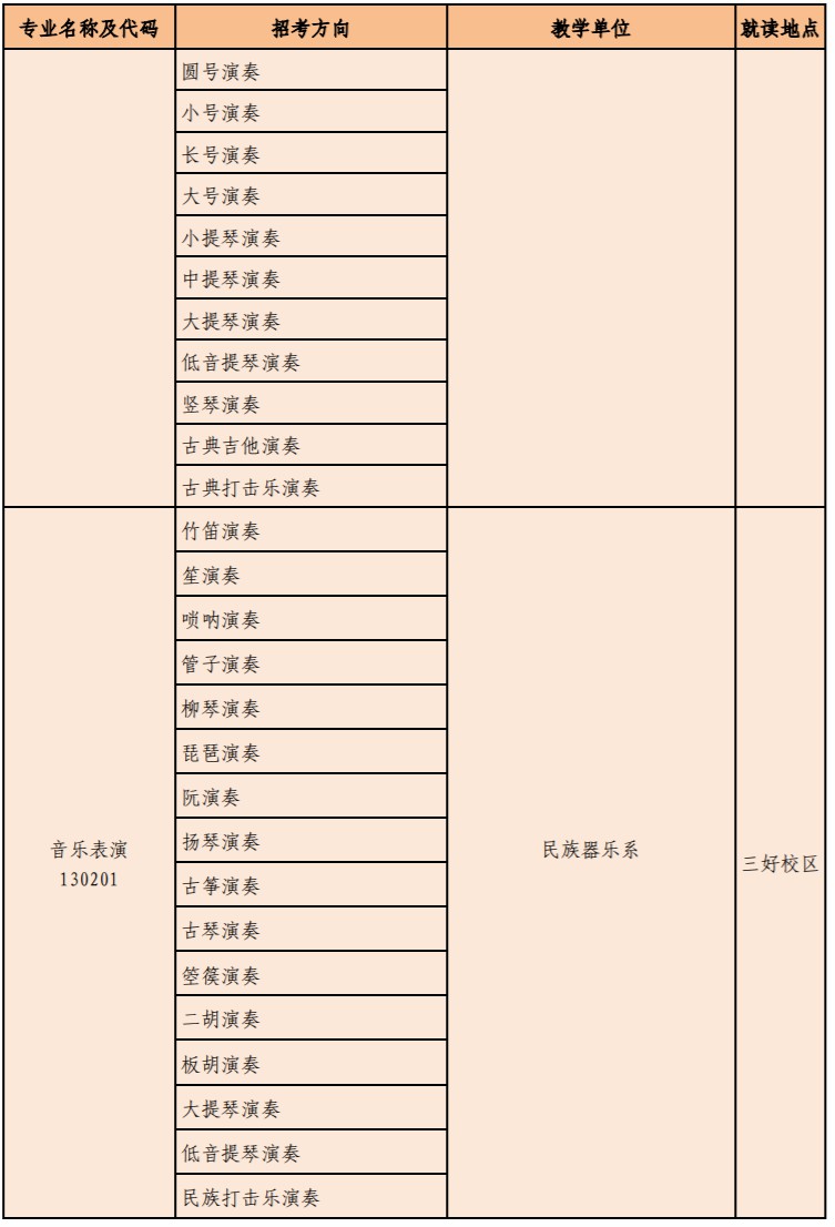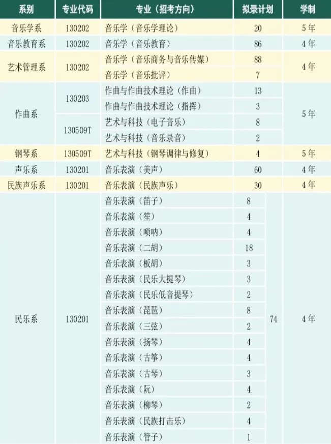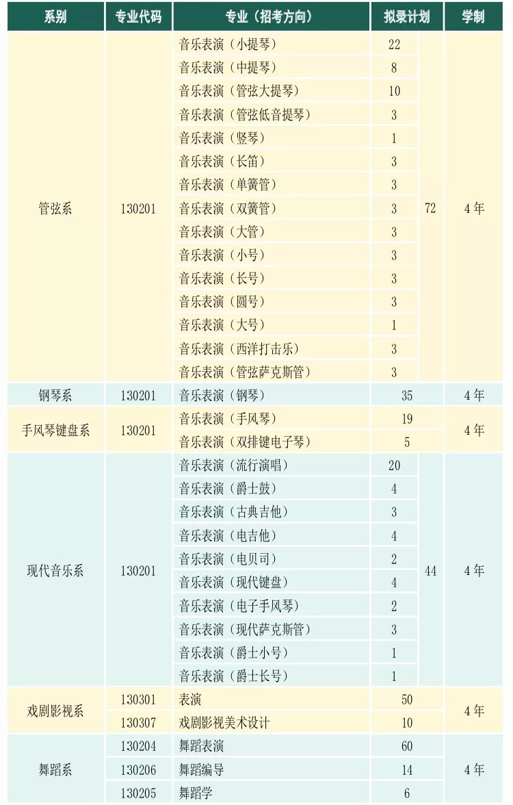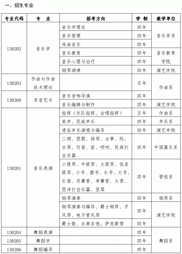 含声乐(民族/美声/流行)、器乐(民乐类、管弦类、打击乐、键盘类、流行类)、指挥、钢琴调律与修复、乐器修造、提琴制作、音乐剧等。
