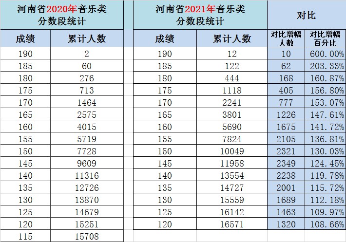 再来看看河南省2021年与2020年音乐类统考分数段对比: