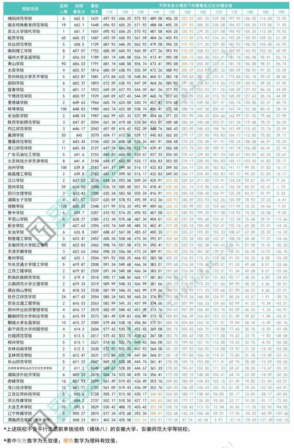 高考750分,不存在高于750分的文化分数,因此左列“灰色”为无效值。安徽省2020年模块八(音乐)本科B类文化省较低控制线为文科349分、理科304分。低于省控线无法提档,因此右列“灰色”为无效值。