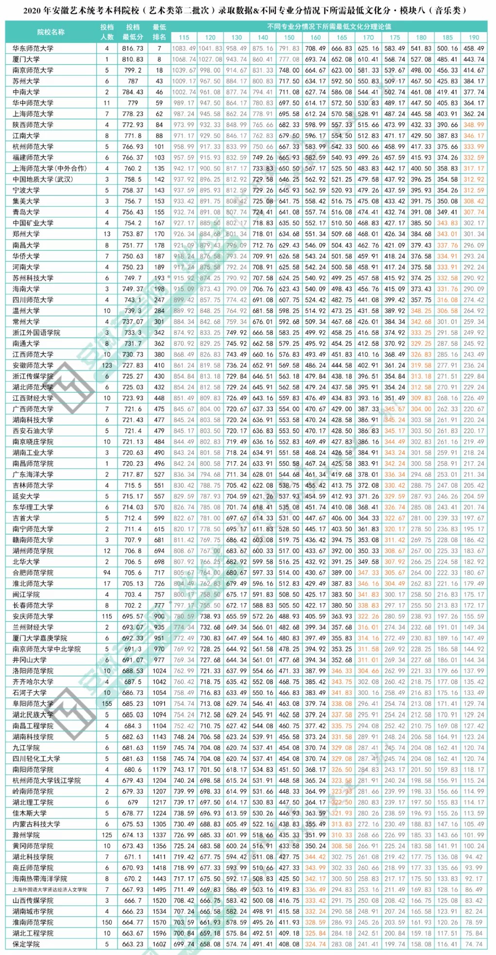 先来看看安徽省2020年统考模块八(音乐)本科二批录取数据,参考在不同的统考专业分数与对应安徽省招生的院校所需要的文化较低分,2021届同学可以参考。