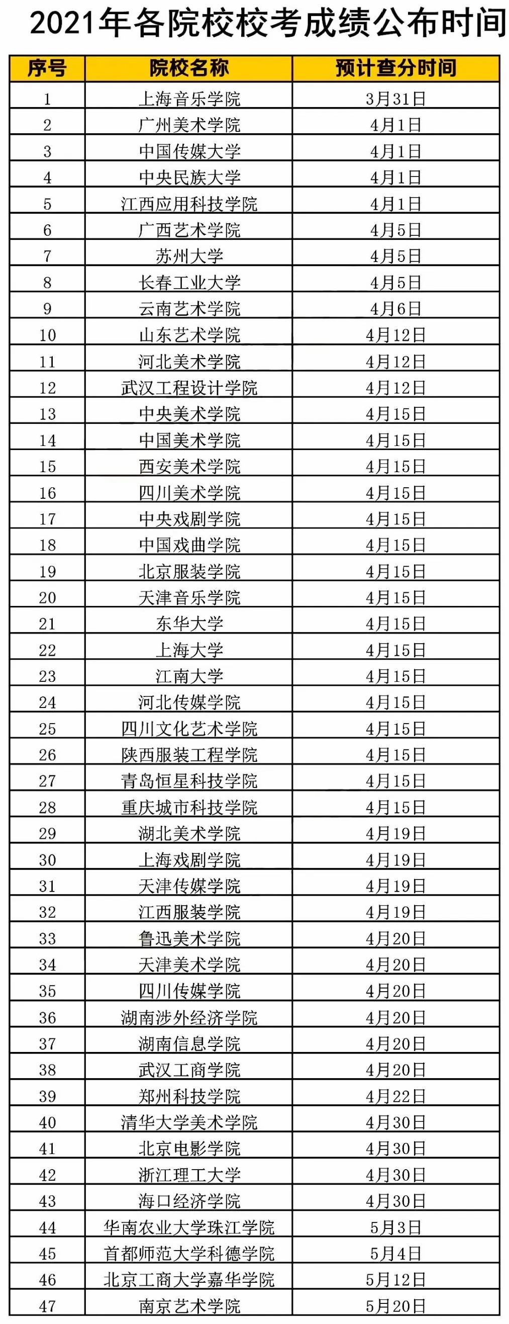 2021年各大院校校考成绩公布时间表