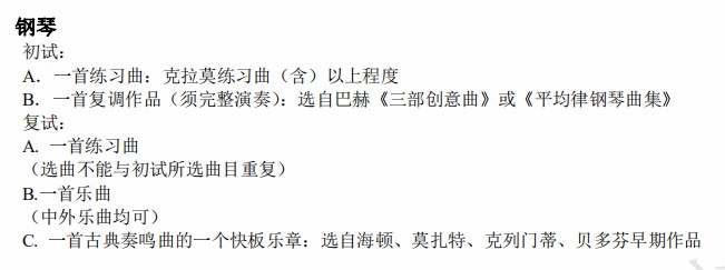 以钢琴专业为例:初试的要求之一是弹一首克拉莫练习曲,或以上程度的练习曲。