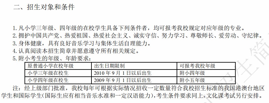 央音附小只招收三、四年级的学生,年龄分别要求在11、12岁,且出生日期在9月1日之后。以招生对象及要求为基础,我们继续看看各专业考试内容和要求。
