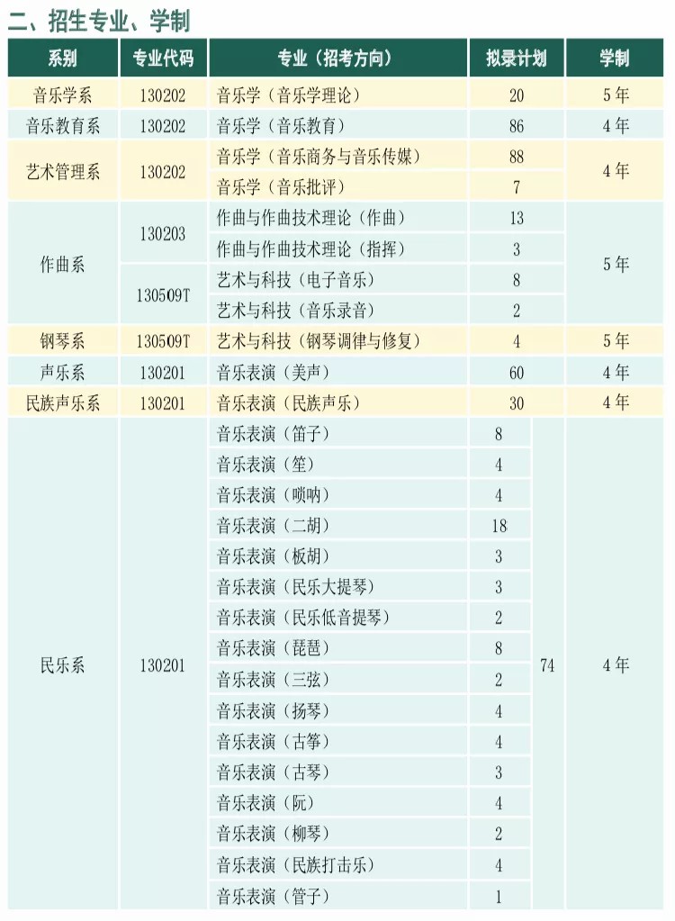 管弦系:音乐表演(中提琴)2020年招生6人,2021年招生8人,增加2人。音乐表演(竖琴)2020年招生2人,2021年招生1人,减少1人。