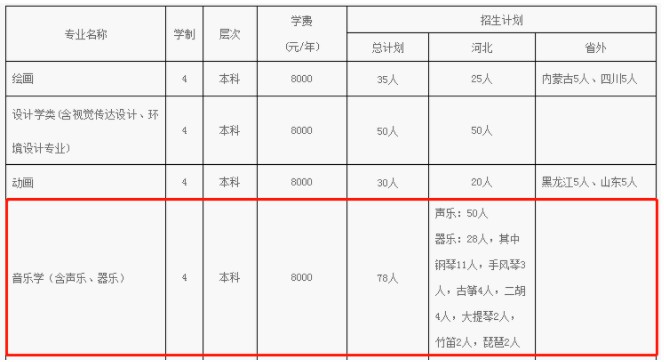 声乐:只招收美声、民声唱法考生。器乐:按小项分别排序录取;黑龙江招收钢琴2名;湖南招收古筝3名;辽宁招收钢琴2名,二胡2名,柳琴1名;河北招收钢琴3名,竹笛3名,扬琴3名,民族打击乐2名,中阮2名,二胡3名,琵琶3名,唢呐2名,低音提琴2名,大提琴2名,笙2名。