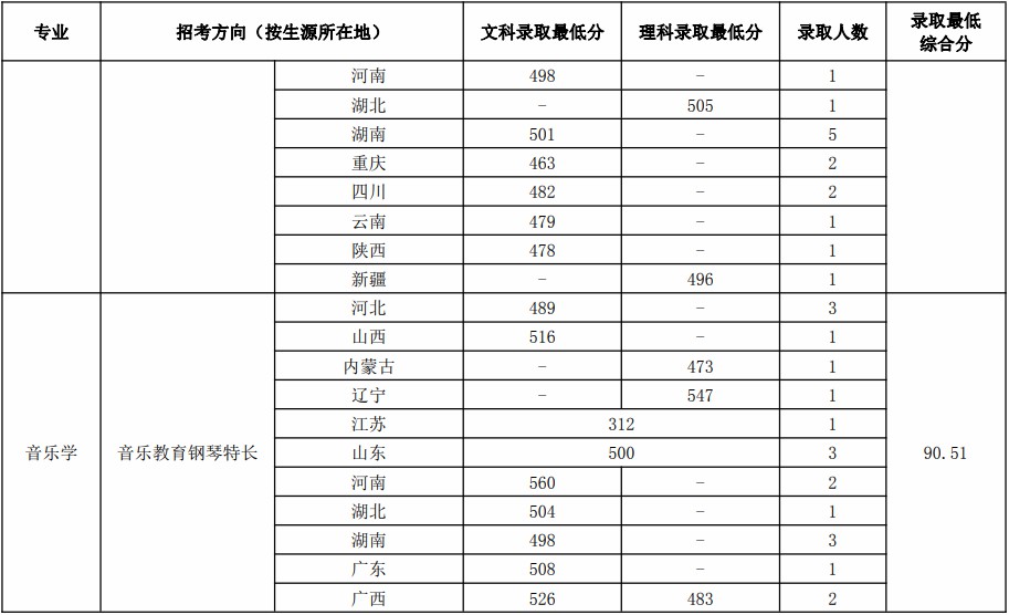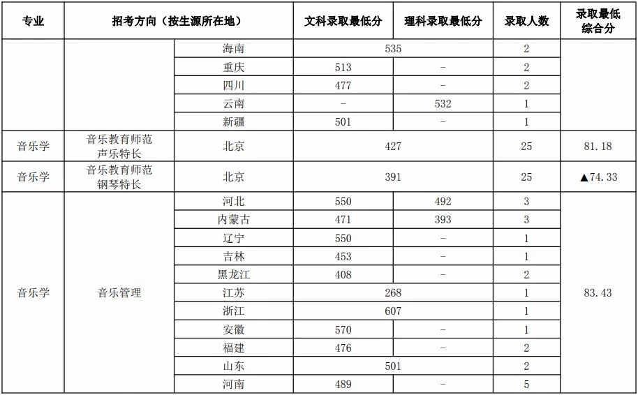 8、湖北省音乐学专业(音乐学理论、音乐管理、音乐心理与治疗)方向按照《省招委关于湖北省2020年普通高校招生录取控制分数线的通知》中艺术类本科分数线执行。
