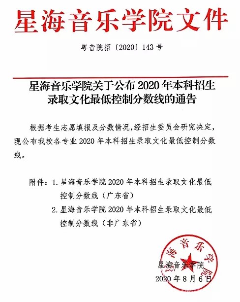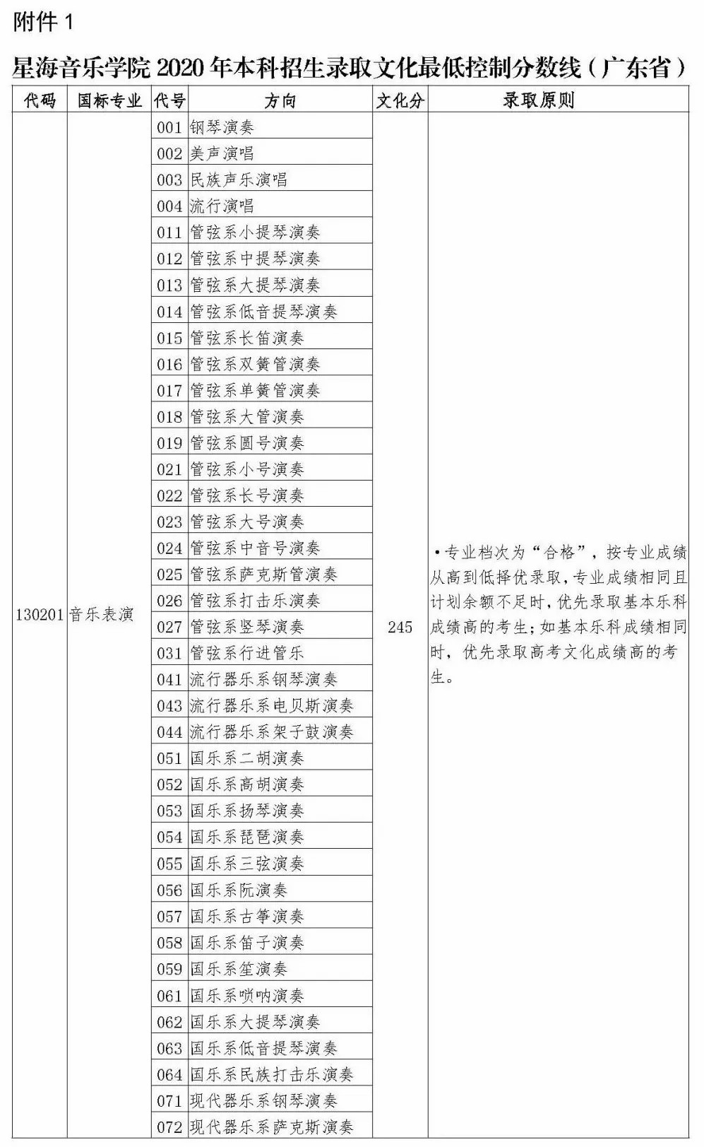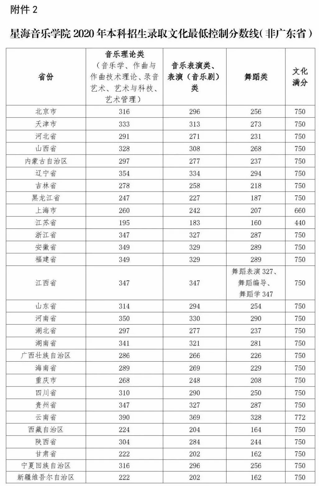 按照教学司【2019】10号文件《关于做好2020年普通高校部分特殊类型招生工作的通知》要求,西安音乐学院2020年本科招生各专业高考文化课录取控制分数线划定如下: