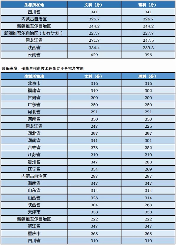 四川音乐学院2020年省外艺术类各专业录取较低分