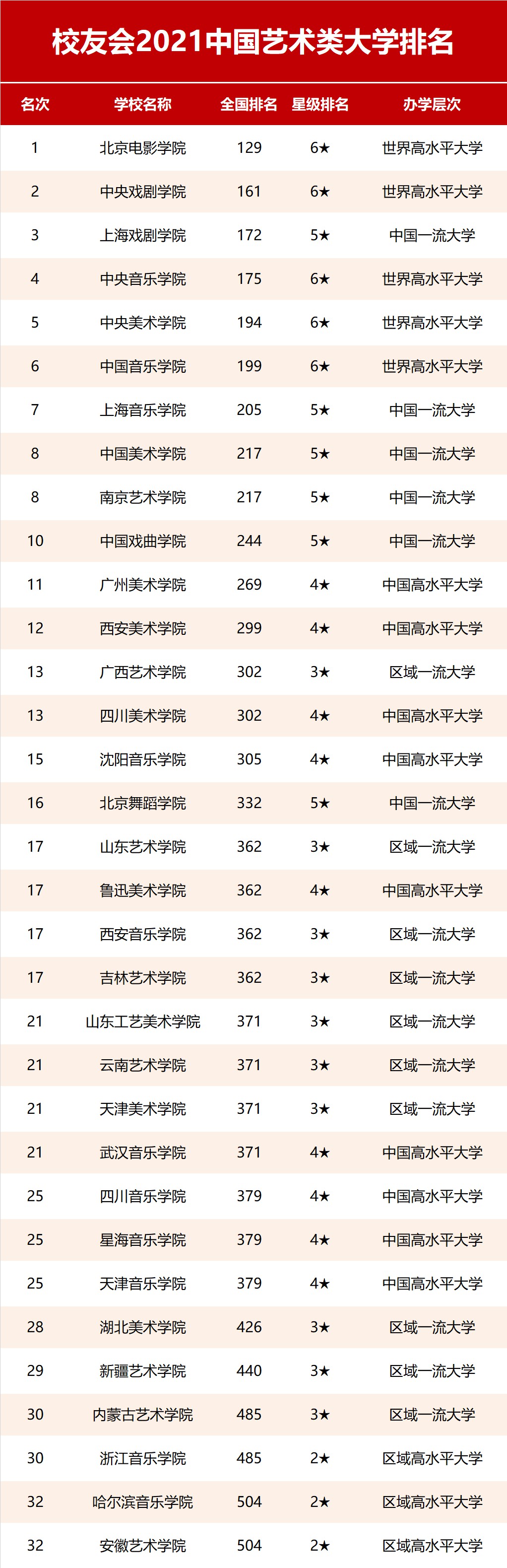 艾瑞深校友会网《2021中国大学评价研究报告—高考志愿填报指南》中,2021中国艺术类大学教学质量排名揭晓。(注:艾瑞深中国校友会中国大学排名是目前中国较具影响力、性和公信力的大学排行榜之一。)