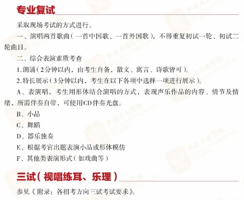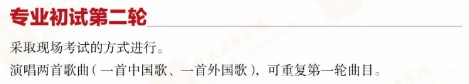 院校校考有的只有一试,有的分初试和复试,还有的分为初试、复试和三试。中央音乐学院、上海音乐学院、南京艺术学院、中国传媒大学、中央民族大学等重点音乐院校为二试或三试。
