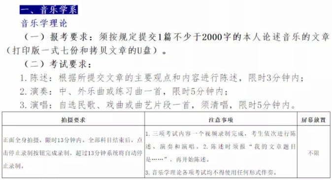 有的省统考按音乐专业分类,有音乐学、音乐表演、作曲与作曲技术理论等。考生选择其中一项,准备作品2首。