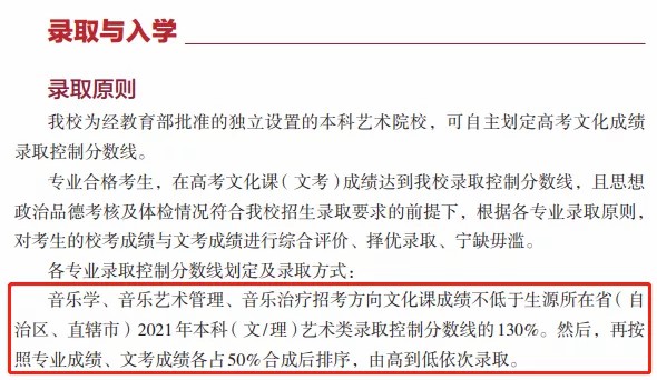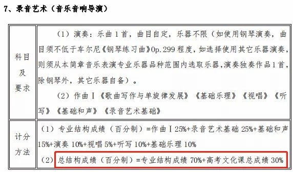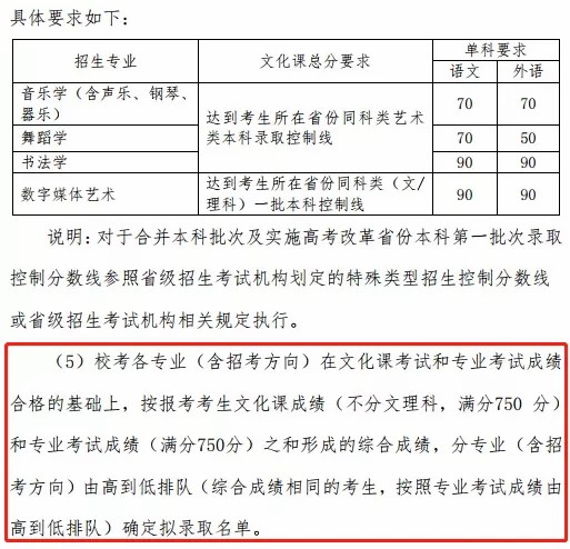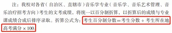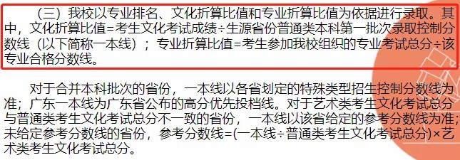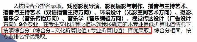 综合成绩=高考文化总成绩×0.3+(专业成绩÷专业*分)×750×0.7。音乐类(含声乐类和器乐类)专业*分为200分。