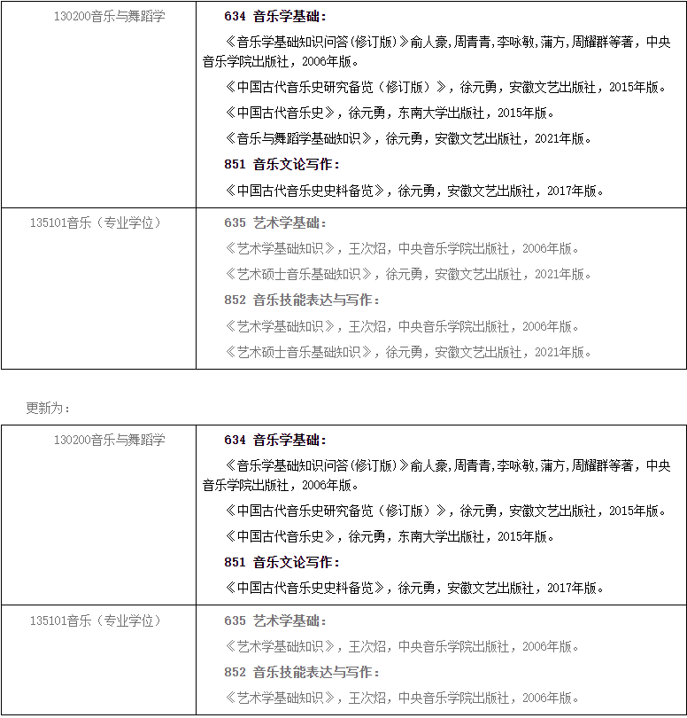 关于南京师范音乐学院2022年硕士研究生入学考试初试参考书目更新的通知