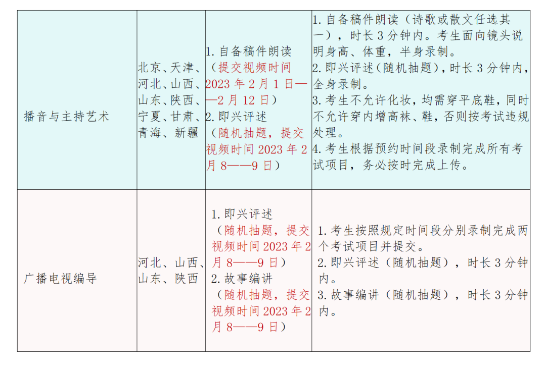 播音与主持艺术,广播电视编导专业需所有省区报名结束后在指定时间段抽题进行考试,这两个专业的考生请先行报名,考试时间为2023年2月8日——2023年2月9日。
