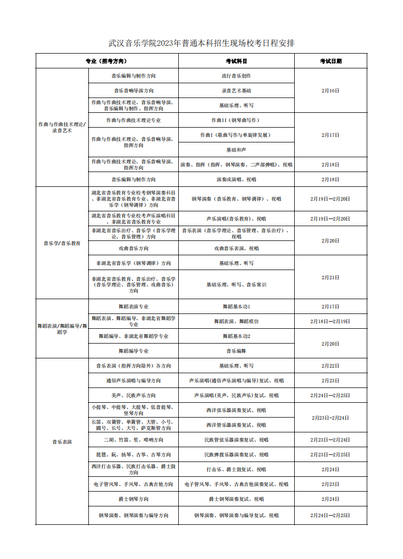 武汉音乐学院2023年普通本科招生现场校考日程安排丨23校考