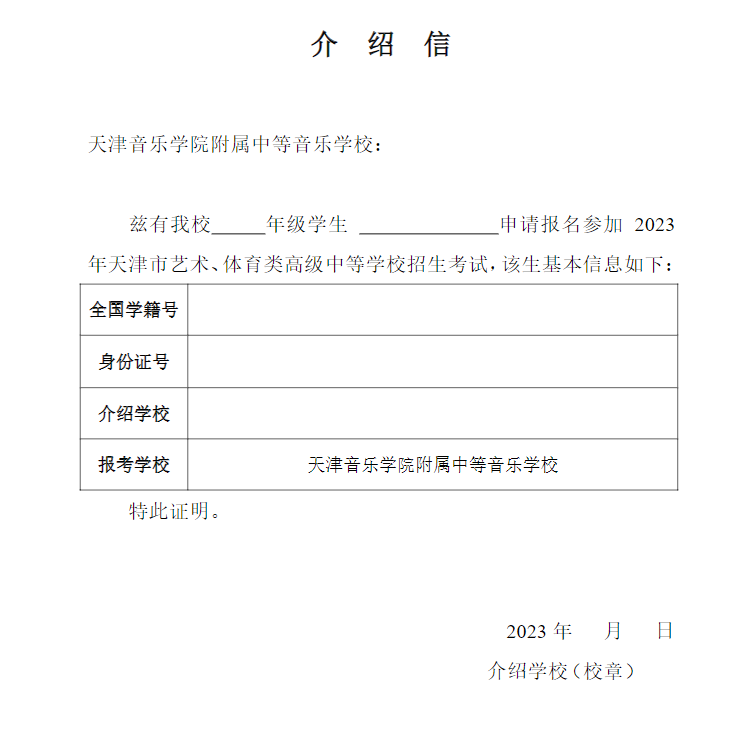 天津音乐学院附属中等音乐学校2023年招生考试报考介绍信