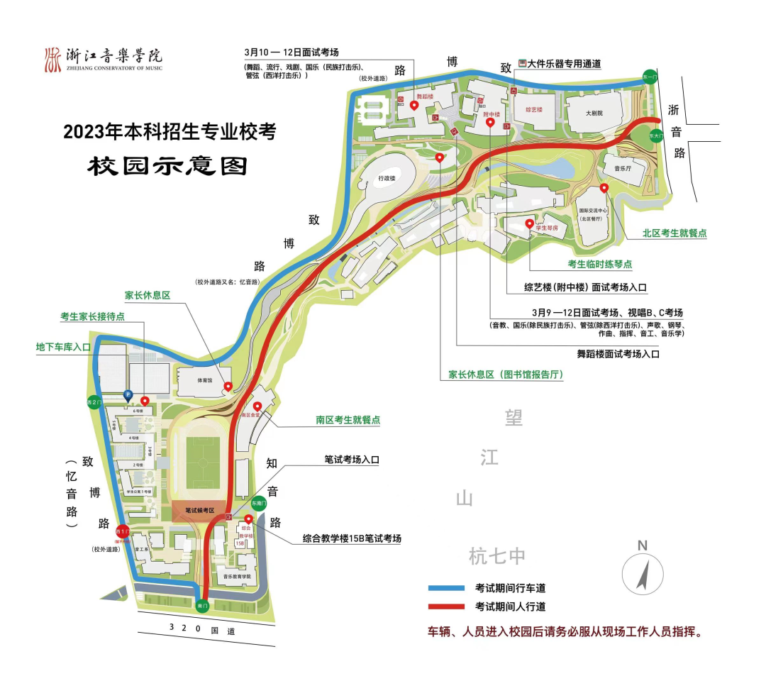 2.如需自驾车辆进入考点,请听从指挥,将车辆停放地下车库,临时接送车辆即停即走;学校周边交通路况复杂,请考生及时了解杭州市区车辆限行规定,选择合适的交通工具提前出行,以免误考。3月9日—12日,学校开放东1门、东大门、南门、东南门、西2门,每天早上6:15后考生、家长方可进入校园。在综艺楼(附中楼)、舞蹈楼参加面试考试的考生,建议从浙音路东1门(行车道)或东大门(人行道)进入校园;在南区综合教学楼15B参加笔试考试的考生,请从南门、东南门或西2门进入校园。如乘坐地铁6号线到浙江音乐学院站,可从知音路“浙江音乐学院东南门”进入校园。
