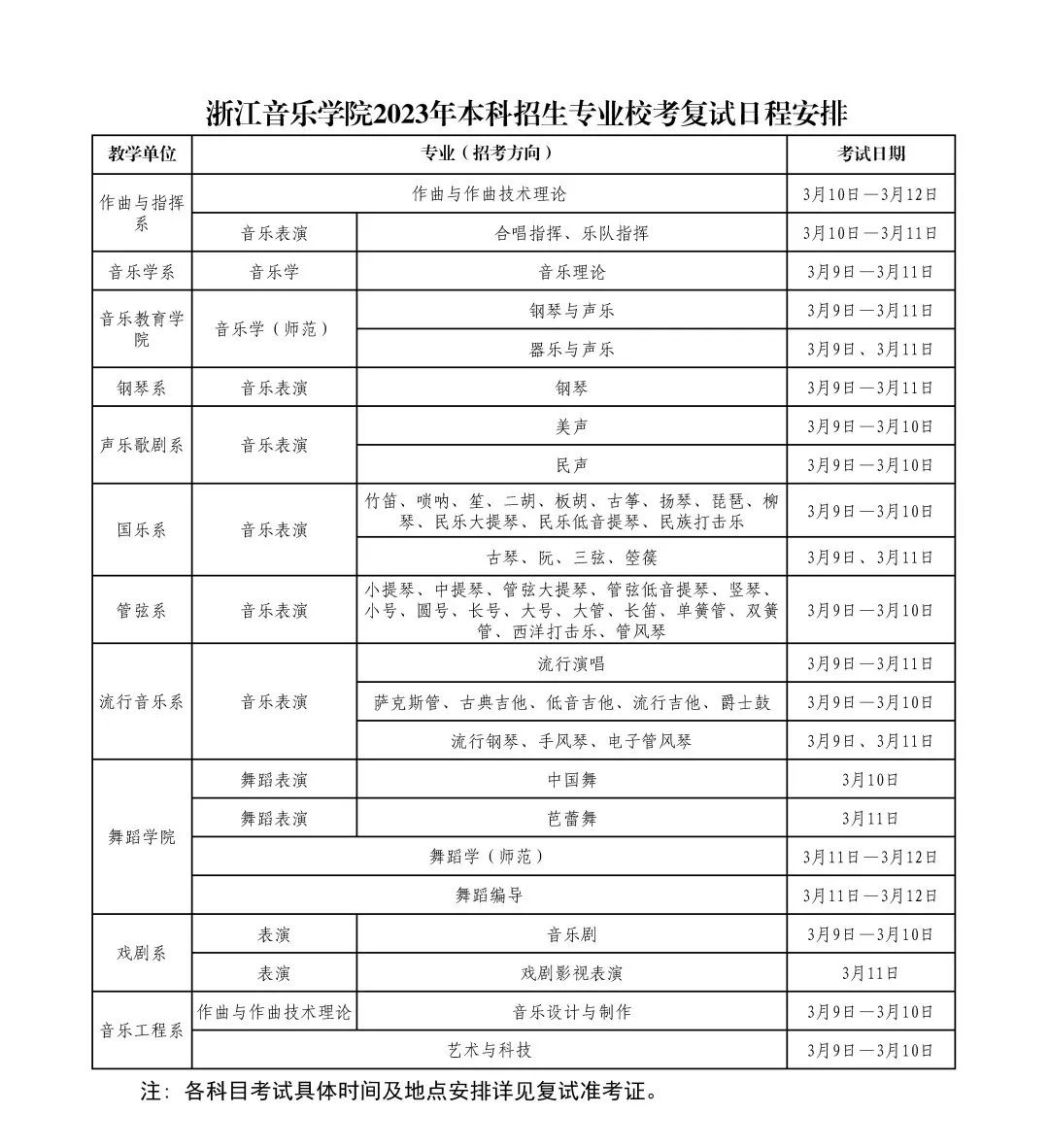 浙江音乐学院2023年本科招生专业校考复试日程安排