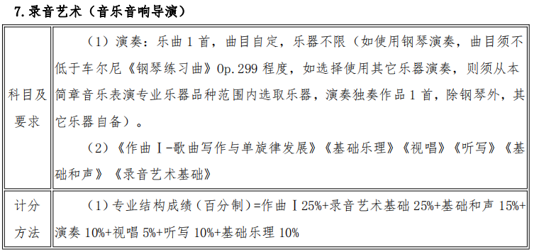 考试内容:即兴创作、和声分析、旋律写作、专业素养常识、歌曲写作、计算机软硬件平台作混音、钢琴或其他器乐能力、乐理、视唱练耳等。